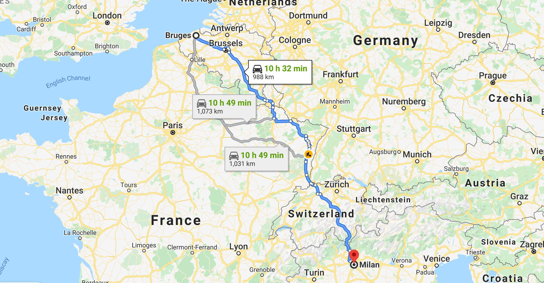 - Neem een korte pauze om wat te drinken, en rij dan door Zwitserland. Hou je niet van de heuvels? Geen probleem, rij dan via Lyon, Grenoble en Turijn.