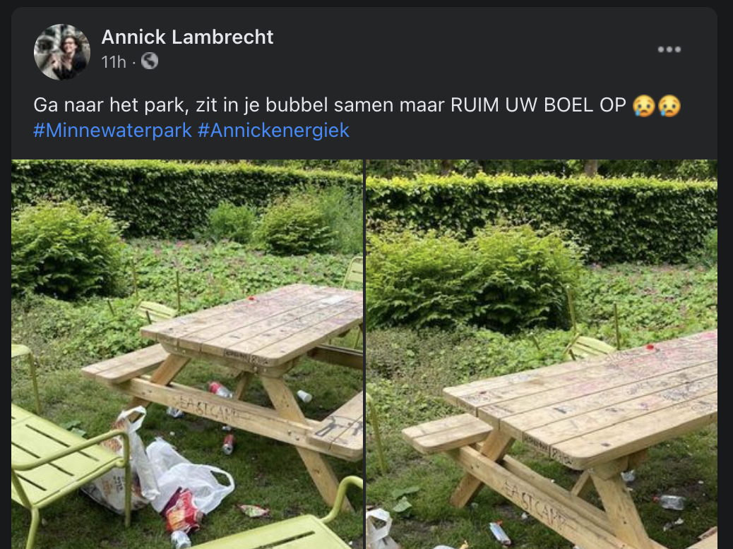 Het Vlaams parlementslid postte een foto van wat afval en enkele stoelen in een park op haar Facebookprofiel. In een mum van tijd stond de post vol intelligente en gevatte commentaren, waarbij vooral 'jongeren' het moesten ontgelden.