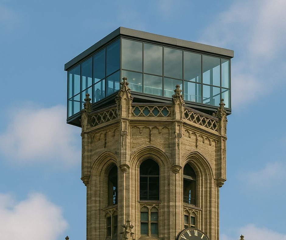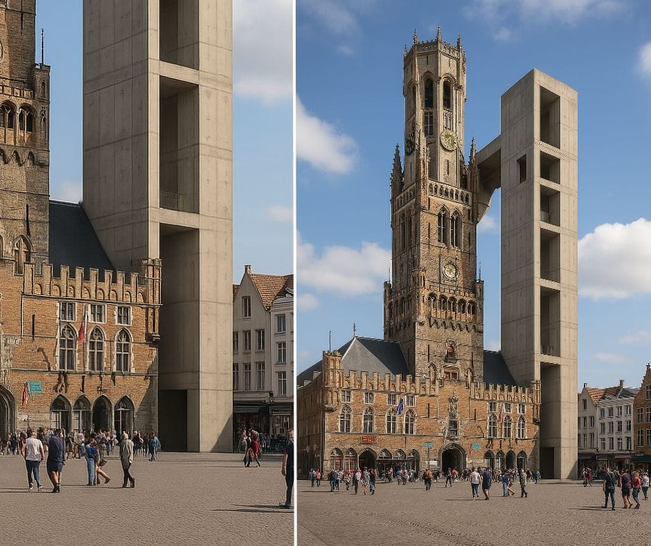 De roltrap komt niet in het 800 jaar oude Belfort zelf, want dat zou respectloos zijn. Daarom wordt er een aparte toren gebouwd, vlak voor het Belfort op de plaats van het linker frietkot op de Markt. "We moesten kiezen tussen het linker en rechter frietkot," legt Marechal uit. "Iedereen weet dat het rechterkot het beste is, dus was de keuze snel gemaakt."