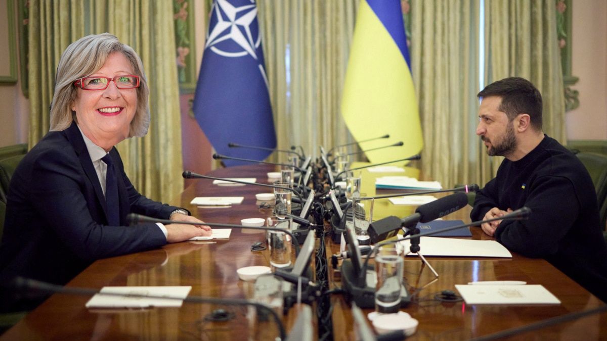 David mocht begin deze week een eerste topontmoeting als NAVO secretaris-generaal op haar conto schrijven. Ze leidde een vergadering met de Oekraïense president Volodymyr Zelensky.