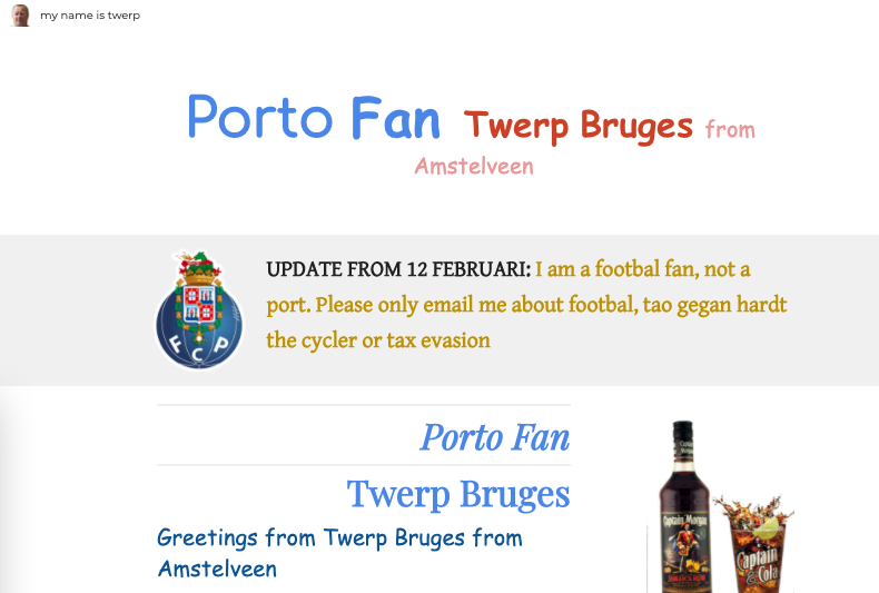 Amstelveener Twerp Bruges (54) onderhoudt namelijk al jarenlang een webstek voor zijn Porto FC-fanclub: www.PortoFanTwerpBruges.com. Twerp is naar eigen zeggen verbaasd over de onaangekondigde fusie: "Hou ik al jaar en dag een mooie webstek open, komt die Brugse spekkie (burgemeester De fauw, nvdr) me opeens vertellen dat hij mijn webstekkie wil. Nou, vergeet dat maar mooi", aldus een misnoegde Twerp, die gerechtelijke stappen overweegt. "Ik word gewoon niet meer met gerust gelaten, ik word constant gebeld om containers te verschepen of cocaïne weg te moffelen."