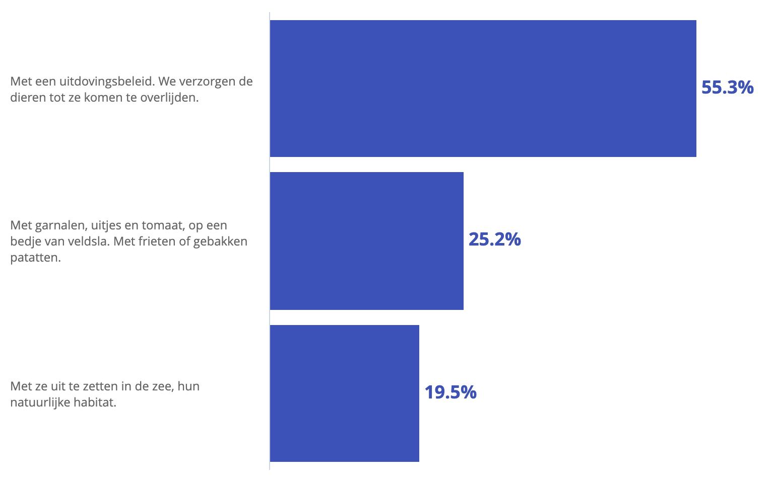 Maar liefst 55% van de Bruggeling is voorstander van een uitdoofbeleid, terwijl slechts 19% de dieren wil uitzetten in het wild. 25% is gewonnen voor een gerechtje met garnalen en frieten.