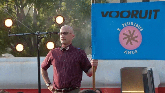Het nieuwe logo van de sociaal-democratische partij Vooruit blijkt een grap te zijn van twee Brugse jongeren. Het logo dat eigenlijk een omgekeerd hakenkruis met enkele V's moet zijn, blijkt niets meer te zijn dan een anusgaatje.