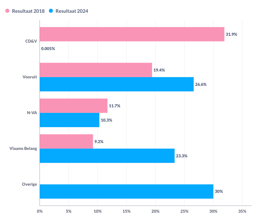 Volgens de laatste peiling haalt de grootste partij van 2018, CD&V, zelfs de kiesdrempel niet. Politicoloog Janne Narten geeft duiding bij dit bijzonder resultaat: "in onze peiling haalde CD&V slechts 4 stemmen, in vergelijking met de 26,130. van 2018. Dat zou neerkomen op slechts 0.005% van de stemmen, en dus ruim tekort om de kiesdrempel van 5% te halen."